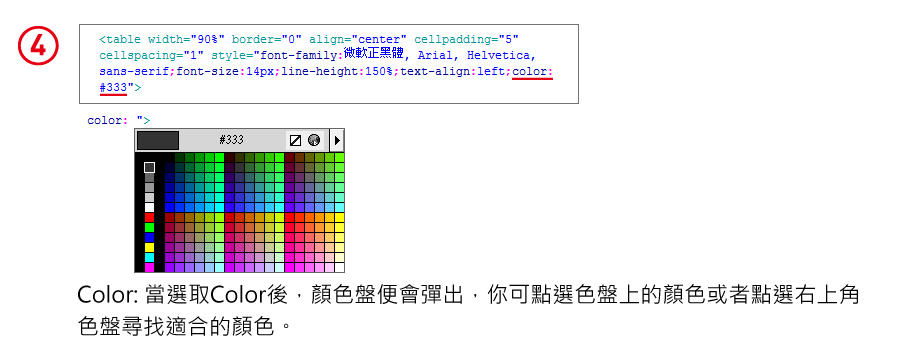 |  | 如何添加顏色到連結? |  | 怎樣移除圖片外的藍框? |  | 怎樣添加圖片描述? |  | 活用表格1之如何建立表格 |  | 活用表格2之增加"列"或"欄" |  | 添加項目/編號清單 |  | 為表單邊框添加顏色 |  | 圖片路徑 |  | 運用STYLE語法嵌入HTML內 |  |  | | 請複製此原始碼: | style="font-family:微軟正黑體, Arial, Helvetica, sans-serif;font-size:14px;line-height:150%;text-align:left;color:#333" | |  | | 請複製此原始碼: | style="font-family:微軟正黑體, Arial, Helvetica, sans-serif;font-size:14px;line-height:150%;text-align:left;color:#333" | |  | | 請複製此原始碼: | style="font-family:微軟正黑體, Arial, Helvetica, sans-serif;font-size:14px;line-height:150%;text-align:left;color:#333" | |  | | 請複製此原始碼: | style="font-family:微軟正黑體, Arial, Helvetica, sans-serif;font-size:14px;line-height:150%;text-align:left;color:#333" | |  | | 請複製此原始碼: | style="padding:10px" | | |  | 為文字添加樣式 |  | 為相片添加邊框顏色 |  | 表格百分比/數值應用 |  | 為文字增加[版權/商標/註冊商標/上標文字]應用 |  | 顯示外部檔 (圖片) | | |